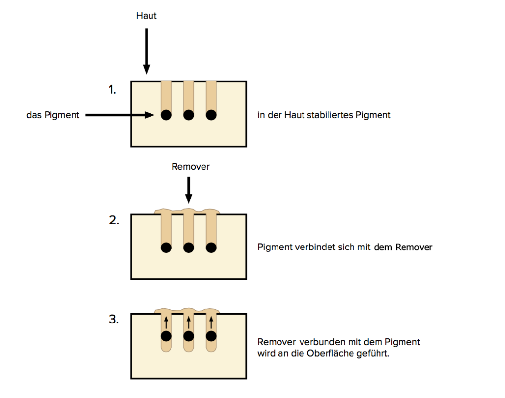 Beim Kontakt von „Pigment-Off“-Remover mit den Pigmenten in der Haut, vermischen diese sich miteinander. Im Gegensatz zu zu den Pigmenten, können sich die „Pigment-Off“-Remover-Bestandteile nicht in der Haut einlagern; sie werden abgestoßen und nehmen die gebundenen Pigmente mit auf die Hautoberfläche.